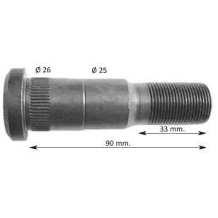 PERNO RUEDA DOBLE RYME FRUEHAUF TRAILOR. Referencia RYME 0414002. Referencia OEM 21420-A15613. Longitud 90mm. Longitud Rosca 33mm. Diametros 26mm y 25mm. Metrica 22x1.5
