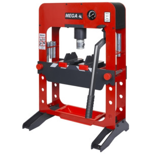 PRENSA SOBREMESA FUERZA MAXIMA 15 TN.Chasis de piezas enterizas, armadas y soldadas para mayor robustez. Calzos reversibles con topes deslizables. Fuerza máxima 15 TN, Altura total 800 mm, Espacio entre columnas 430 mm, Espacio pistón-mesa min-max 45-338 mm, Ancho x Fondo pies 550x350 mm. Ref. Mega PRS15